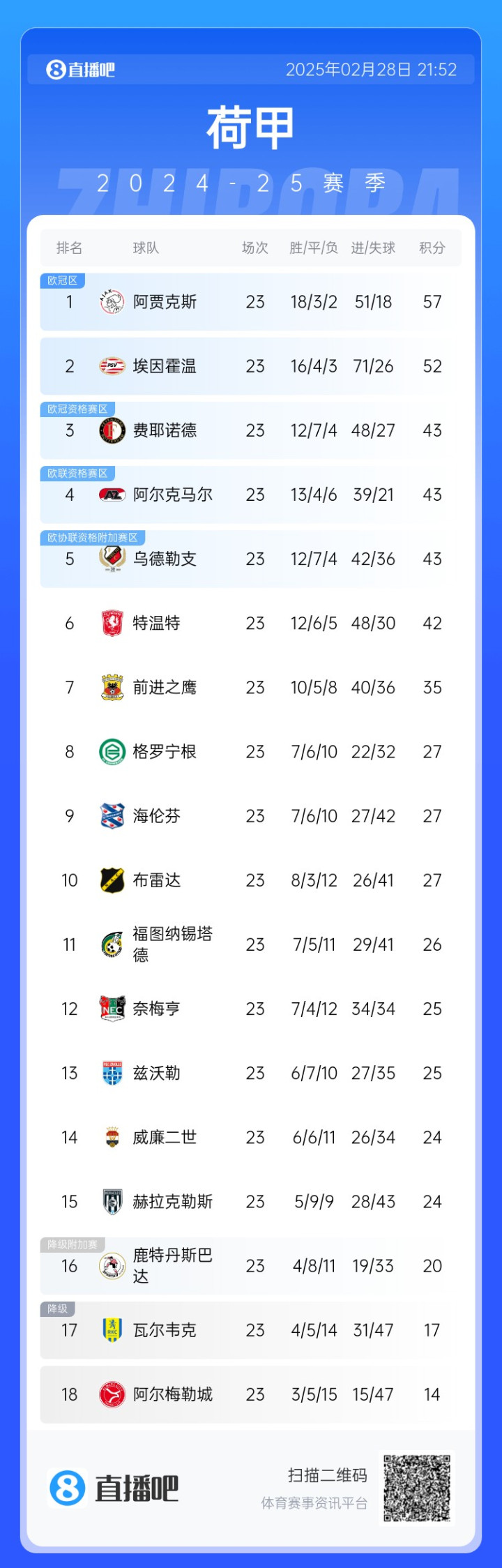 直播吧02月28日讯荷甲进行到第23轮,阿贾克斯在上周2-0击败前进之鹰,豪取荷甲8连胜。